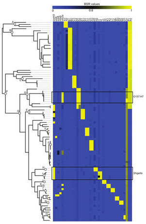 Background. As whole genome sequence data from bacterial isolates becomes cheaper to generate, computational methods are needed to correlate sequence data with biological observations. Here we present the large-scale BLAST score ratio (LS-BSR) pipeline, which rapidly compares the genetic content of hundreds to thousands of bacterial genomes, and returns a matrix that describes the relatedness of all coding sequences (CDSs) in all genomes surveyed. This matrix can be easily parsed in order to identify genetic relationships between bacterial genomes. Although pipelines have been published that group peptides by sequence similarity, no other software performs the rapid, large-scale, full-genome comparative analyses carried out by LS-BSR.Results. To demonstrate the utility of the method, the LS-BSR pipeline was tested on 96 Escherichia coli and Shigella genomes; the pipeline ran in 163 min using 16 processors, which is a greater than 7-fold speedup compared to using a single processor. The BSR values for each CDS, which indicate a relative level of relatedness, were then mapped to each genome on an independent core genome single nucleotide polymorphism (SNP) based phylogeny. Comparisons were then used to identify clade specific CDS markers and validate the LS-BSR pipeline based on molecular markers that delineate between classical E. coli pathogenic variant (pathovar) designations. Scalability tests demonstrated that the LS-BSR pipeline can process 1,000 E. coli genomes in 27–57 h, depending upon the alignment method, using 16 processors.Conclusions. LS-BSR is an open-source, parallel implementation of the BSR algorithm, enabling rapid comparison of the genetic content of large numbers of genomes. The results of the pipeline can be used to identify specific markers between user-defined phylogenetic groups, and to identify the loss and/or acquisition of genetic information between bacterial isolates. Taxa-specific genetic markers can then be translated into clinical diagnostics, or can be used to identify broadly conserved putative therapeutic candidates.
